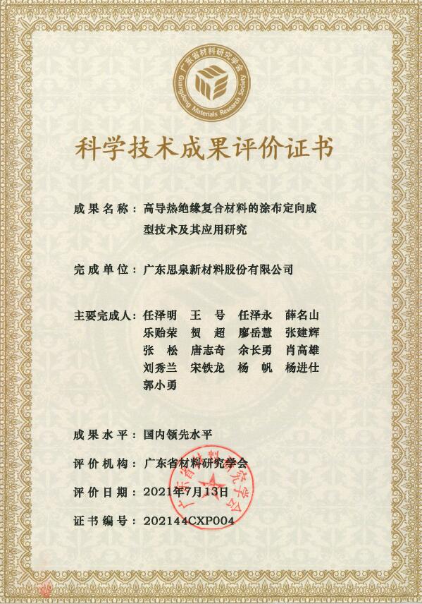 2021年7月,思泉新材完成的“高導熱柔性石墨膜的高溫燒結(jié)技術及其應用研究”和“高導熱絕緣復合材料的涂布定向成型技術及其應用研究”兩項科學技術成果被廣東省材料研究學會認定為具有國內(nèi)領先水平。